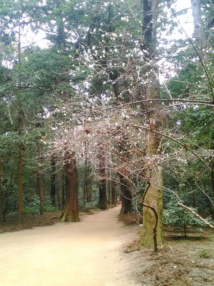 週末、鹿島神宮の森の中を散歩してます。(背景は北浦の夕日)