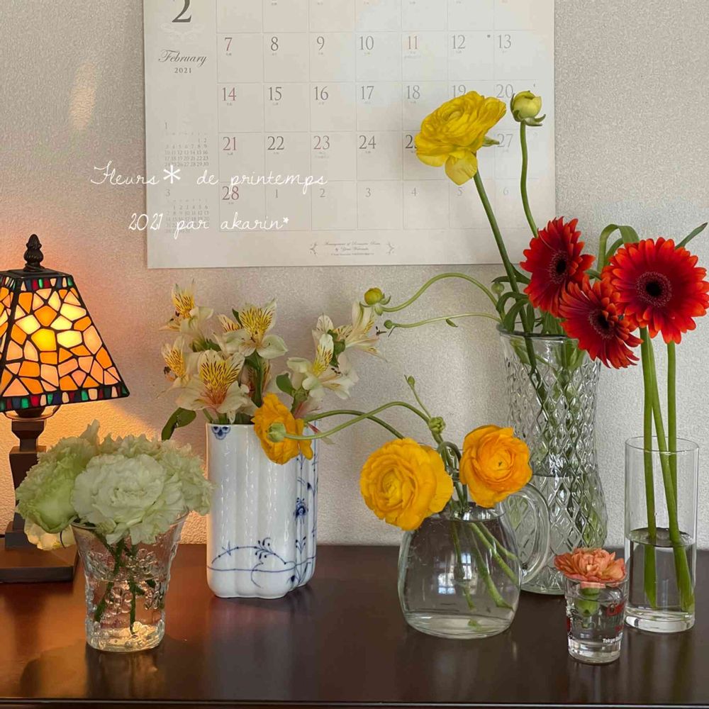形も大きさも、素材も違う花器にこんなふうに生けても、素敵ですね💗