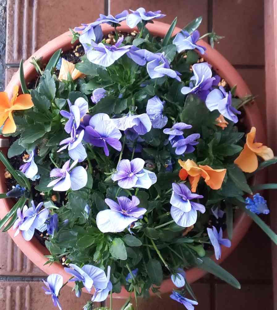 ムスカリの花が咲いてきた✨ビオラのプランター中央を良く見たら😍チューリップ🌷の芽も成長していた😃⤴️✨