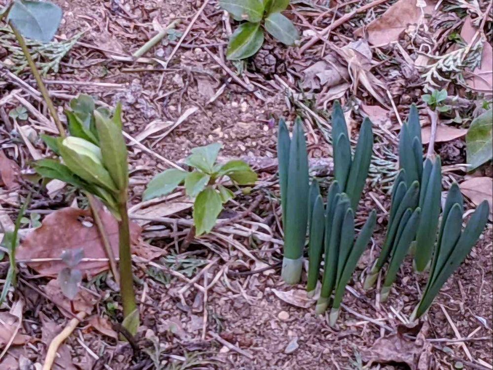 半日陰花壇にようやく出て来てくれた白いクリスマスローズ。水仙とお隣同士。これも又白だったような…。☺️