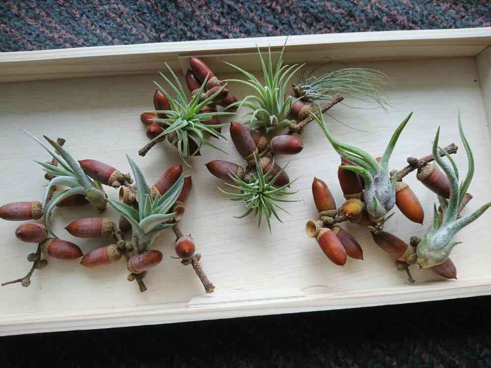 この前拾った枝付き、帽子のどんぐりさんたち、どうしようかと迷っていてそうだと思い付いたのが、エアープランツとのコラボ