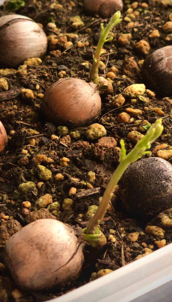 タッパウェアに土を盛り、並べて植えたクヌギのどんぐりが発芽🌱