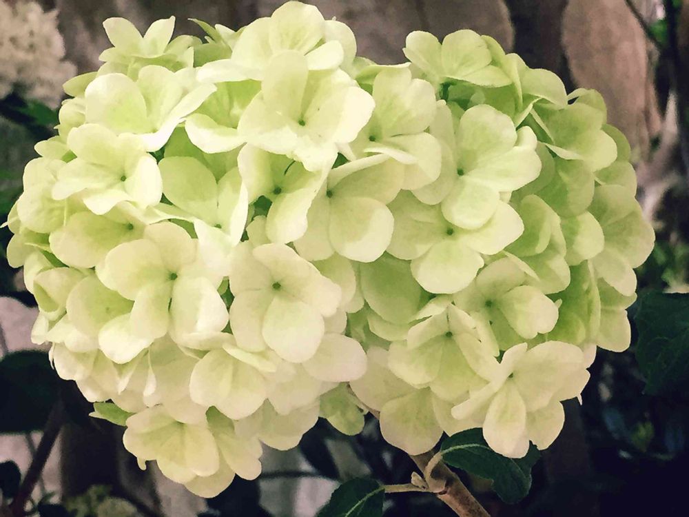 ゴールデンウィークの頃から、アジサイのように小花が集まってまるで雪玉のような、初めは黄緑色で、時間が経つにつれて段々と白く変化する茶目っ気ある花です。