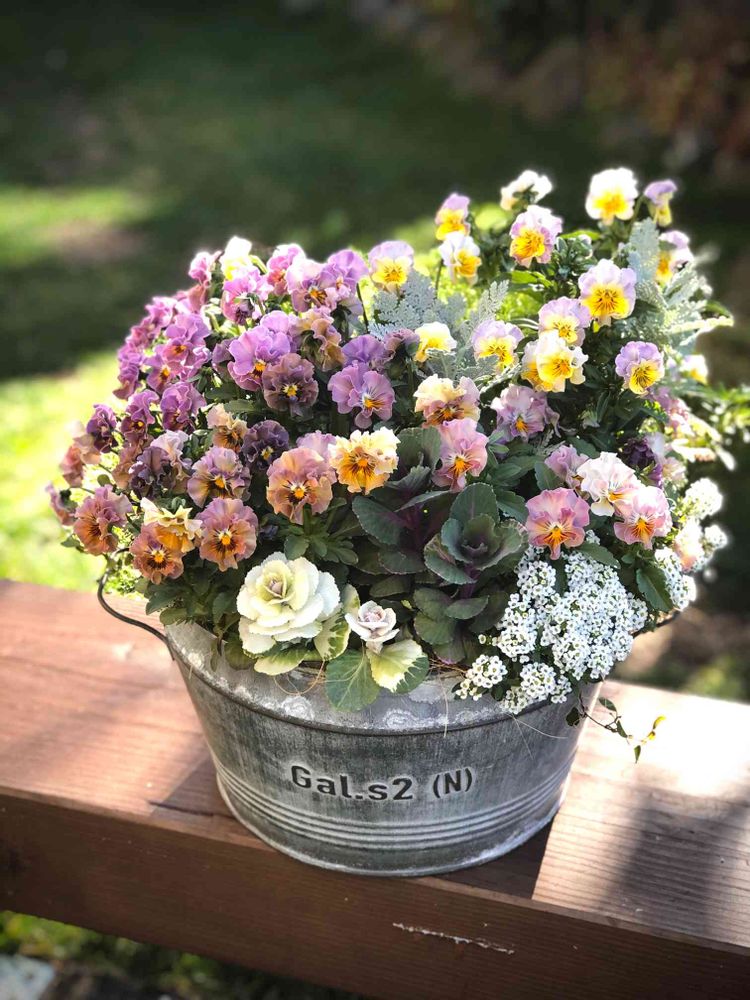 12月に寄せ植えしたブリキ缶、ちょうど3ヶ月経ちモリモリに🌸🌼💠でも右側が徒長してる💧