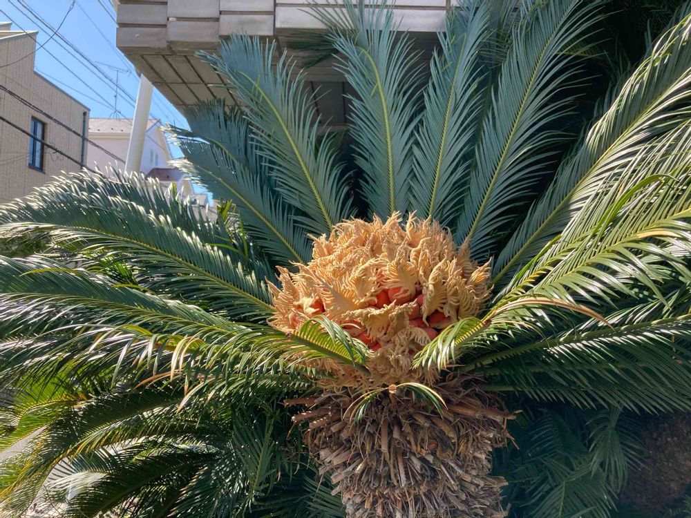 近所のマンションの玄関にあるソテツ。昨年11月にオレンジ色の実を蓄えていたが、今も同じように蓄えている。