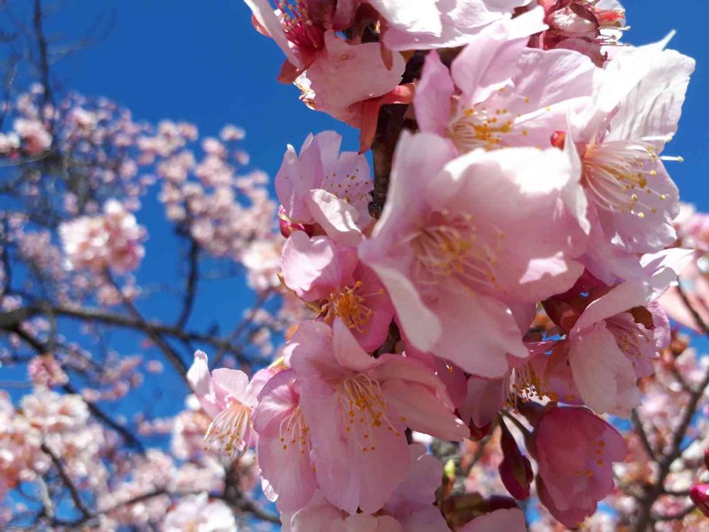 河津桜のピンク色が優しい雰囲気で青空に映えますね~(ღˇᴗˇ)。o♡