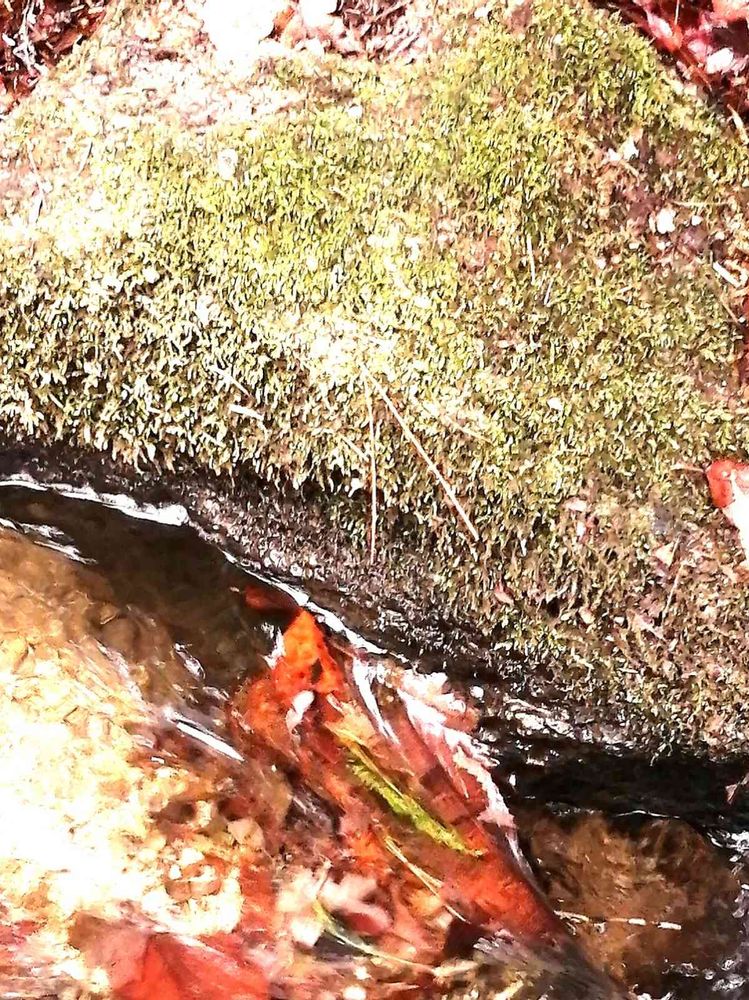 水辺の石に苔がびっしりついてます、氷は綺麗に解けました