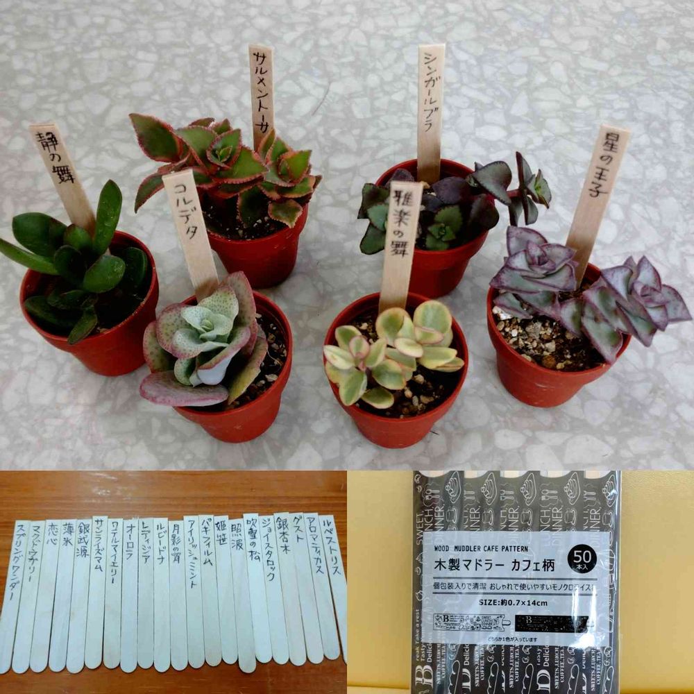 いつも皆さんに教えてもらう名前もちゃんと名札にしなくっちゃと、100均の木製マドラー半分にして書いてみた‼️