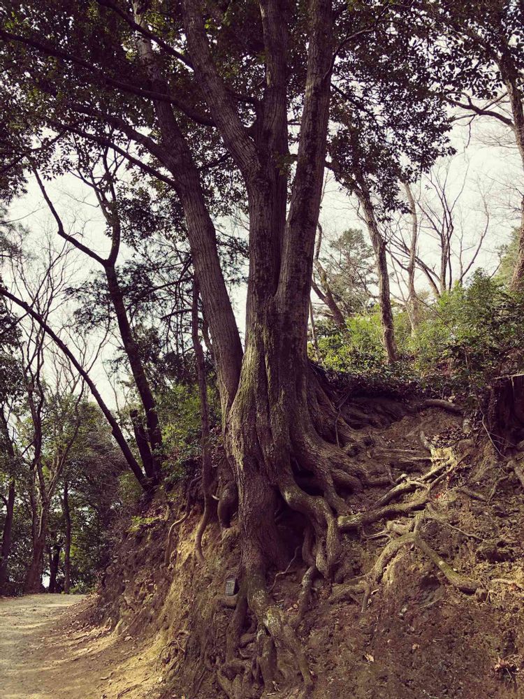 それ程巨木ではないですが、根がむき出しで土手で頑張ってる木、名前は、スダジイです。