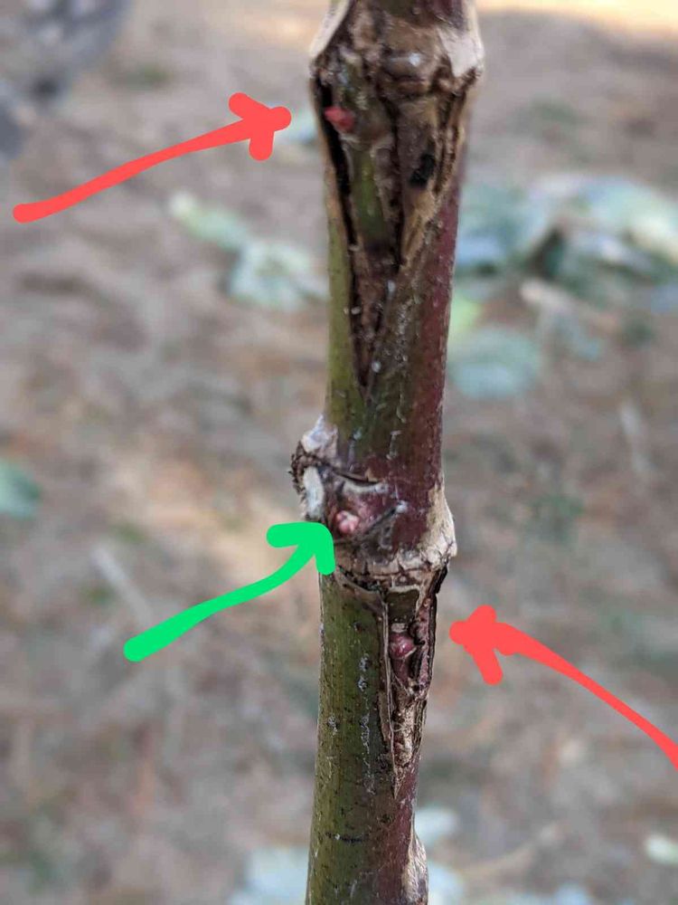 赤い矢印が芽接ぎ成功で赤い芽がポチッとありますよ😃