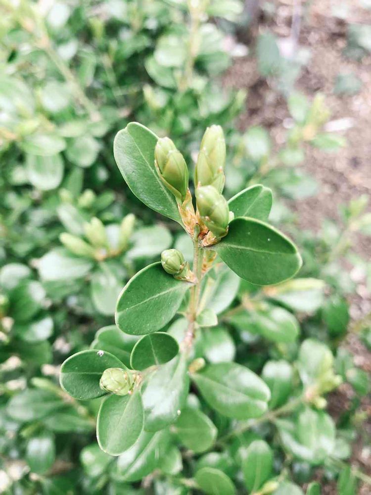 苗でお迎えしてから4年目、初めて蕾がついたボックスウッド(西洋ツゲ)。