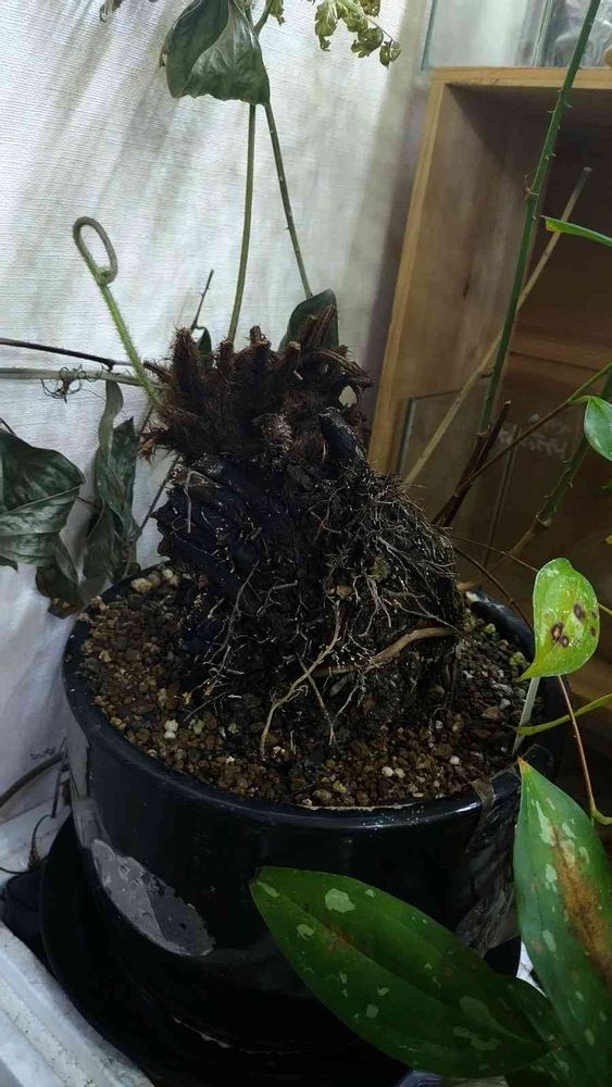 なるほど! うちに来たときは元々はこんな感じでしたね。頂点が完全に枯れて硬化してしまったので、横に寝かせたて埋めています。どこまで根を上げるかが問題ですね。下の方に塊が成長していたらいいんですが。もう見られたかもしれませんが、植え替えの動画をアップしてるので、今一度見てくださいね。「カツモウイノデの植え替え」で出てきます。このとき根は丸刈りにしてますね。太い根が下の方に伸びてたらイケますね。