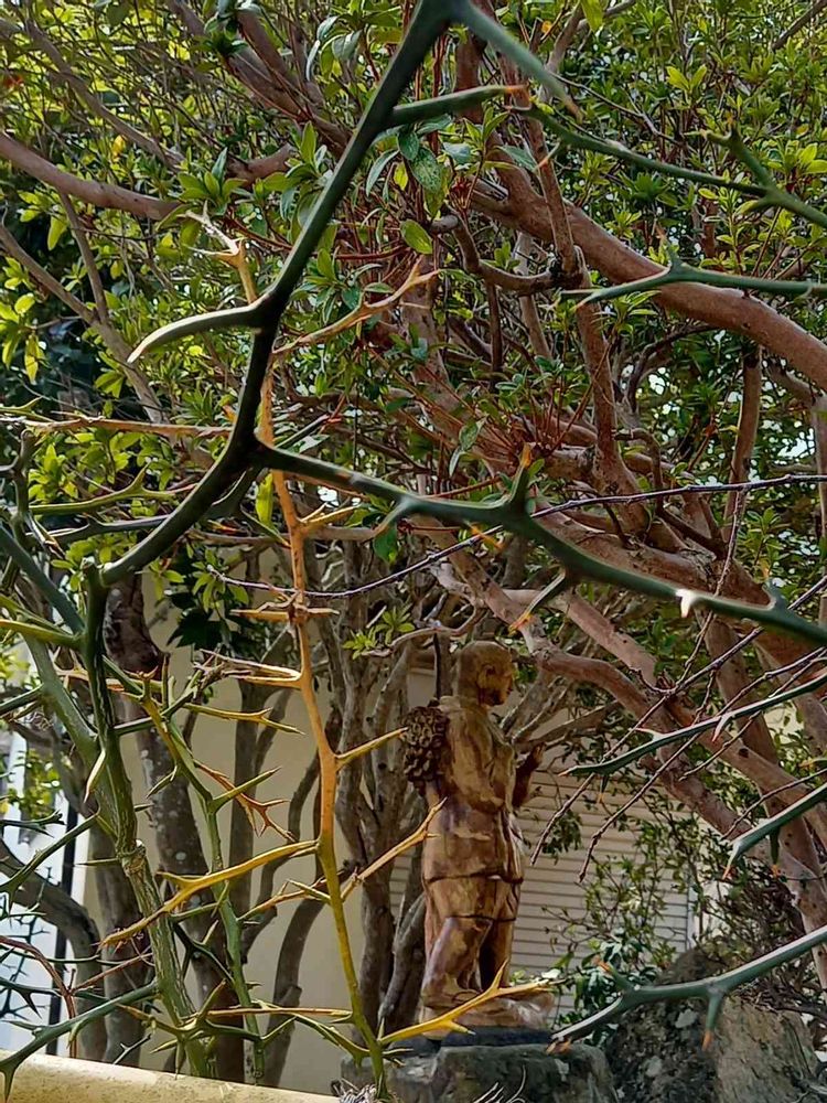 さん、カラタチでした。葉も白い花も黄色い実もないとトゲの集まりなんですね。ありがとうございました。白い花や黄色い実がついてる時期にまた見に行きたいなとおもいます。