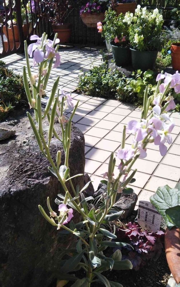 一重のストックは寄せ植えの一部なんですが隣の葉牡丹と競いあいどんどん伸びております。