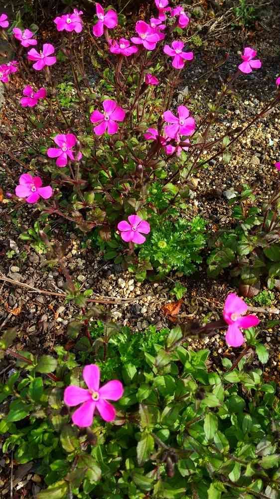 シレネ カロリニアナはナデシコ科マンテマ属で、ツルコザクラはナデシコ科サボンソウ属で、別種の花なんですが、見た目はよく似てます。ツルコザクラの方が花の色が淡く、大きさもひとまわり小さい感じです。