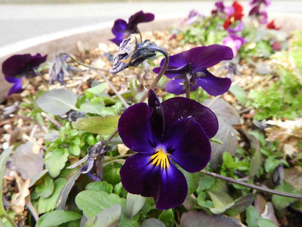 真っ直ぐに列べられた、木のプランターに植えられていたパンジーの花が、綺麗でした。