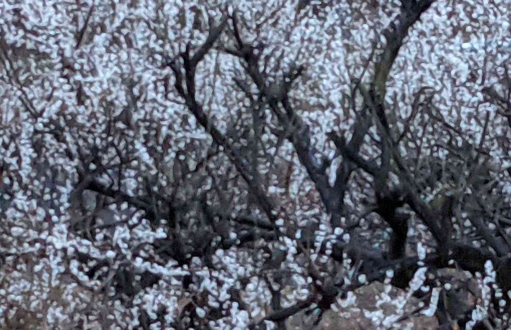 日が暮れて雨中の白梅林。…あと少しきれいなお花を楽しませてくれると、その後ひと日ひと雨ごとに充実した甲州小梅の実を実らせて行きます。😌