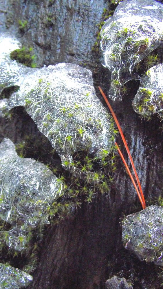 しぶき氷漬けの苔、石は温度が高いので、先に解けます。