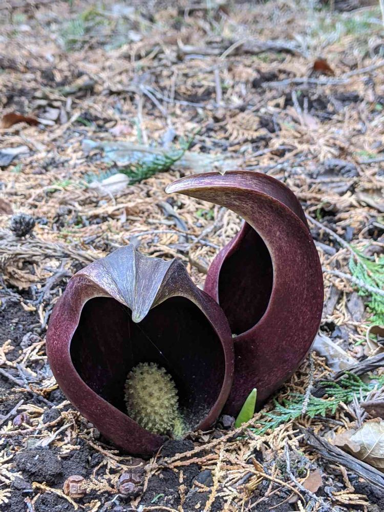 あちこちにニョキニョキと生えています。匂いを嗅いでみたら薬品?工場みたいな匂い?って言ったら良いのでしょうか?一番乗りに虫を集める為この時期に開花します。