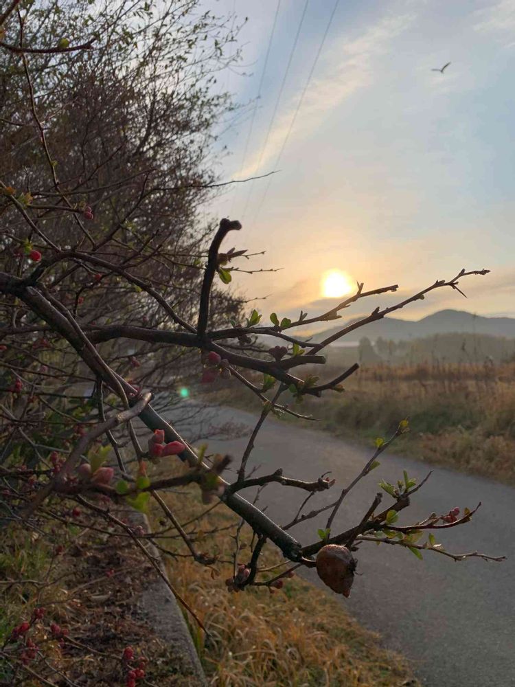 綺麗な朝日に木瓜の蕾、鳥。絵になるね✨✨えっ、よしくんどこどこ?!🐕