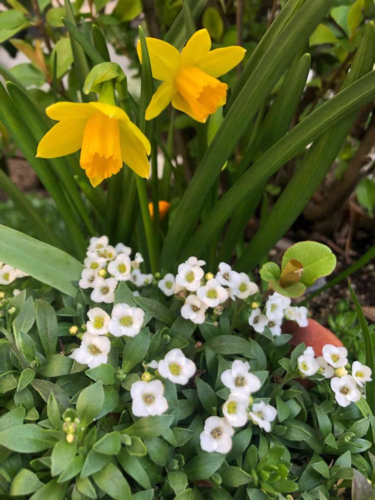 黄色の水仙とアリッサムがとてもイキイキして見えます✨🌿✨