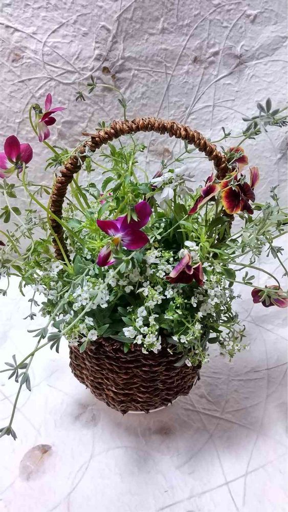 苗もある程度土を落として水苔を巻いて苗と苗を2、3個一緒に巻きつけて花束のように植え込みます💐💐フワフワっと。成長が遅いので長く楽しめるようです✌😊が、水やりは🧺だけに、お花にはかけないように。だそうです。腐らない用にするのと、肥料をたまに上げること、乾いたらバケツに水を貼り籠をどっぷりです。