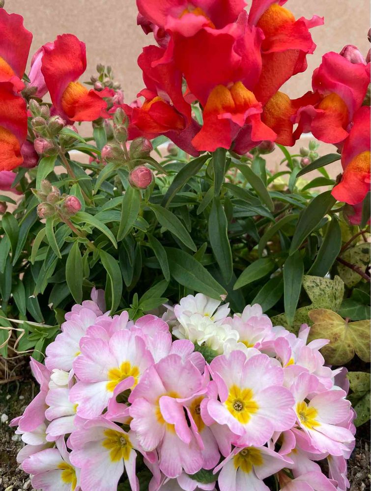 先日も投稿した寄せ植え、今度はプリムラジュリアンさんがよく見えるように撮影✨縁取りのやさしいピンクに春を感じます🌸