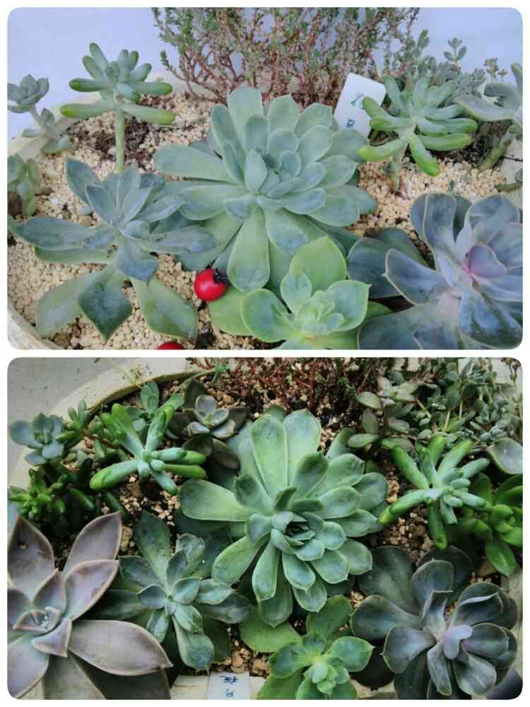 こんばんはまた☔です😅 上は多肉始めて2ヶ月の頃作った寄植え何とか夏を乗り越えてくれてありがとう😉🎶