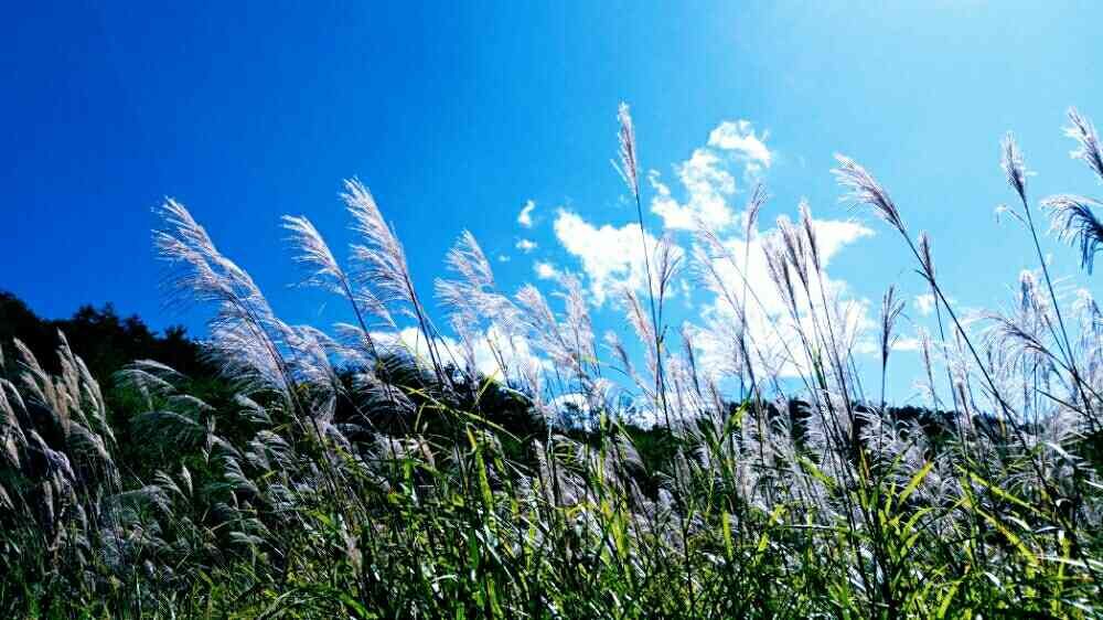 水色から青へのコントラストと雲とススキの白、美しいです✨✨✨