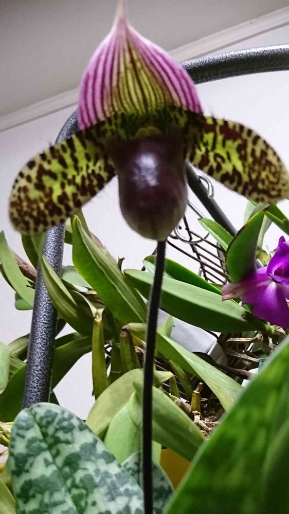 先週の太陽園芸さんのイベントで恐る恐る手に取ったパフィオぺディラムさんが咲きましたよ。フォルムは耳たれ洋犬。耳は皮膚病にかかったように小さな黒い立体的なポツポツが。耳の輪郭からはまつげのような毛が出てきた。キモい。なかなかずーっと見られん。