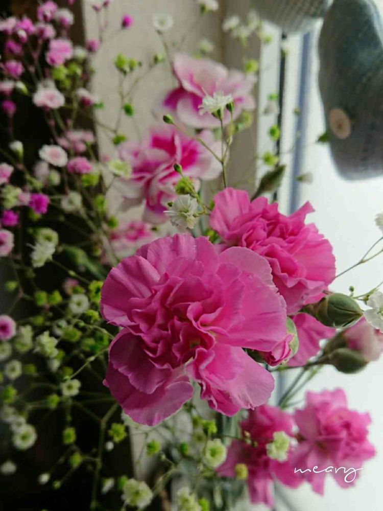お雛様に飾ったお花🌸 桃の花は散ったけど…この子達は涼しめな玄関へ避難!! 夜勤明けで帰ってきた私をお出迎え♪ おっ!もう少し頑張れそうだね! 花と語らう一時が至福〜❤️