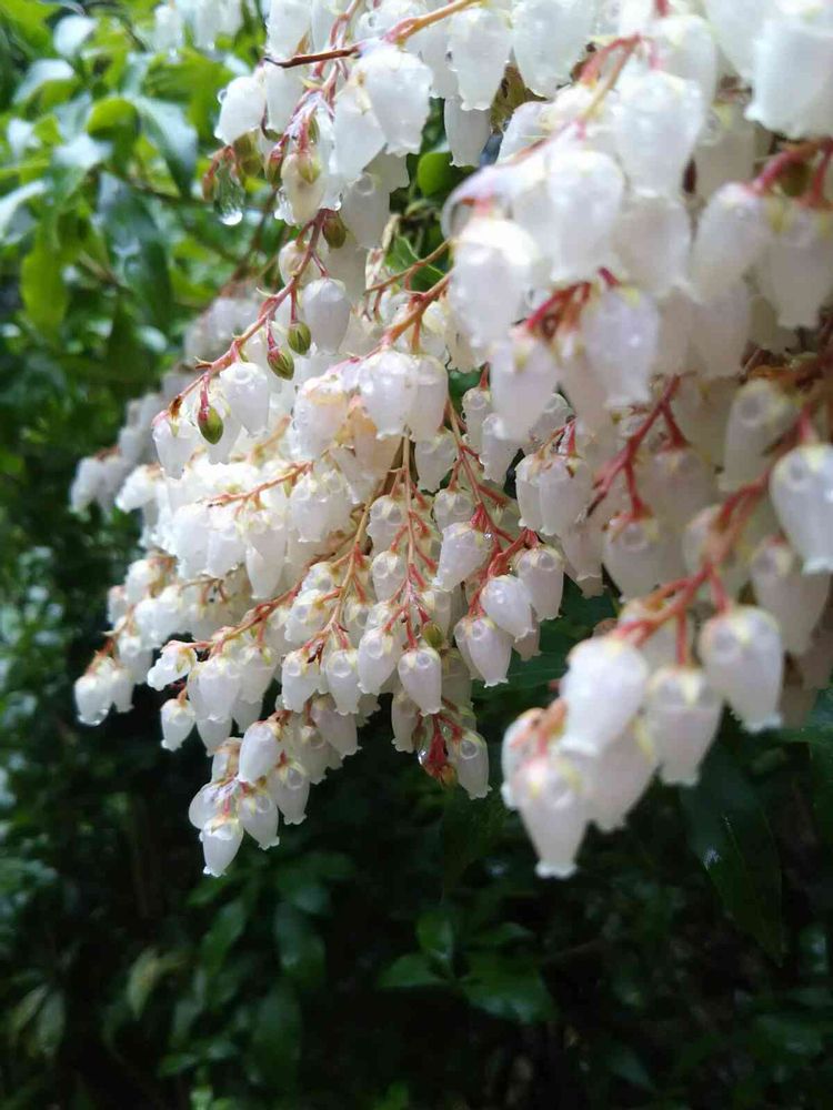 雨に濡れた透明感のある真っ白なアセビ