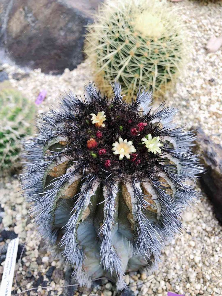 ブルーグレーがかった肌のボディにごま塩まだらの棘、てっぺんは黒い棘と黄色い花🌼と赤い蕾(実?)