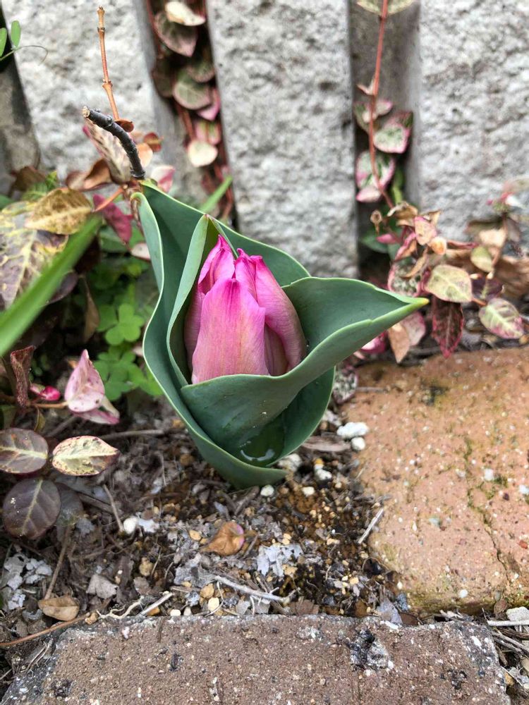 チューリップは花の下が長く、すぐ垂れてきますが、これは可愛いからと、葉に守られてるよう💕