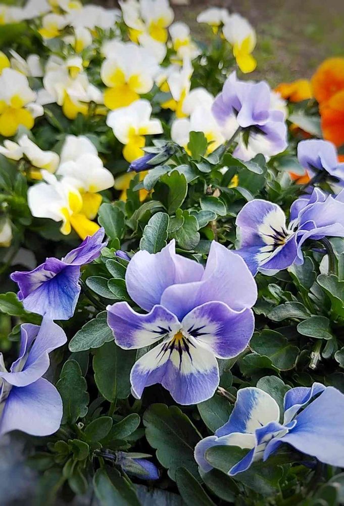 黄色と白のビオラさん、満開で綺麗ですね〜💛青いビオラさんも、無事咲いてくれて良かったですね💙👌💓
