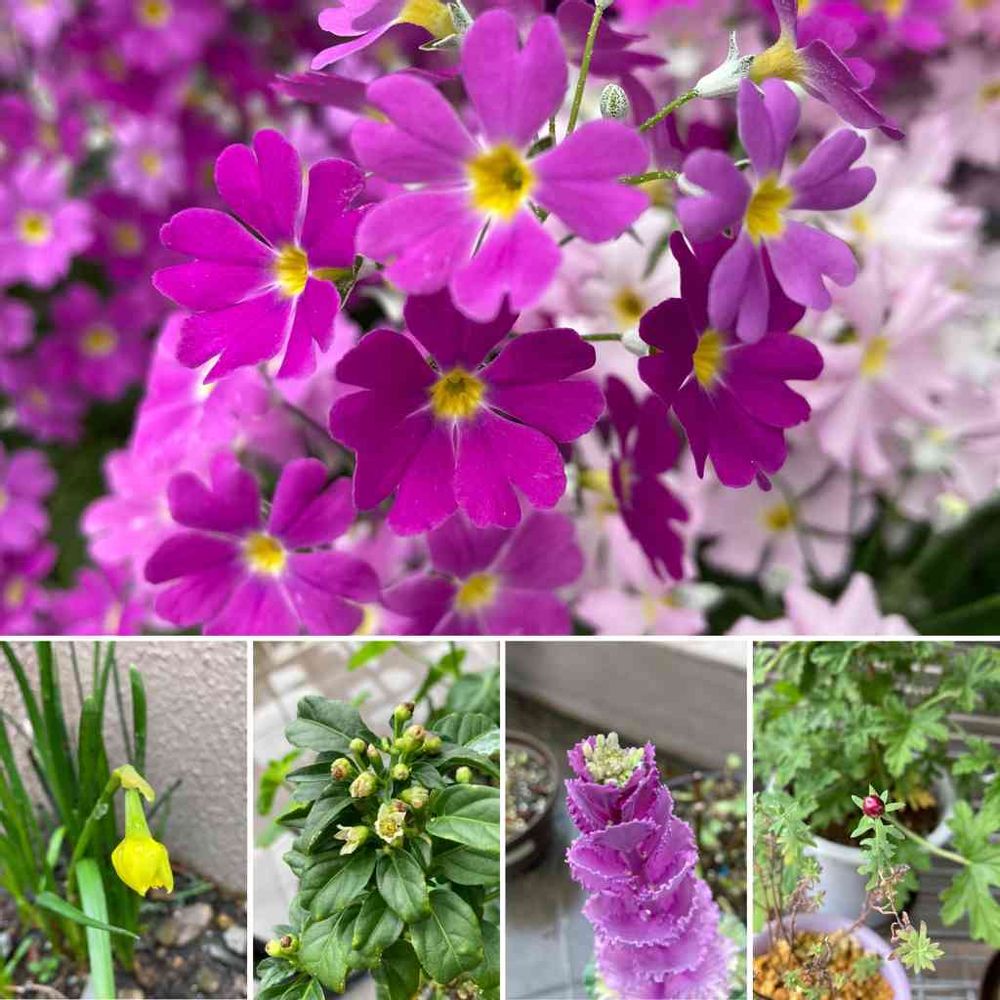 pic上段は満開のサクラ草、下段は水仙、鑑賞用トウガラシ、葉牡丹、花かんざしの今朝の様子です。