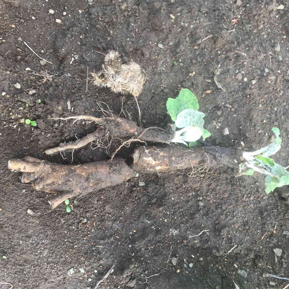 牛蒡。種の入った部分、今出た芽、2年目の春掘り上げた根。