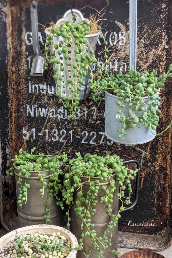 グリーンネックレスさん🟢たち、ブリキの鉢がよく合いますね〜💓