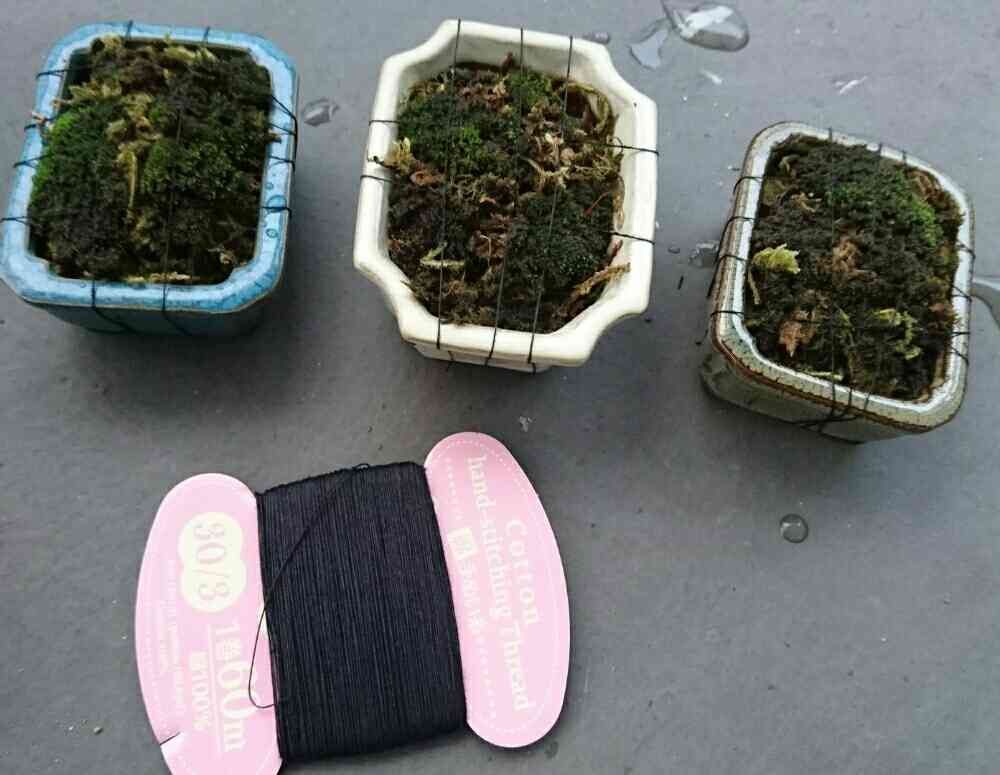 苔玉に植わってた観葉植物を、植え替えてから放置気味だった苔。やっと救済しました。このためにダイソーに糸を買いにいったら多肉たちが入荷してて、買ってしまいましたが。蚤の市で見つけたミニ盆栽用の鉢に。