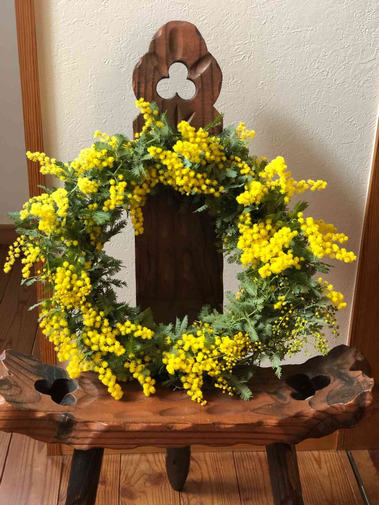 鮮やかに黄色いポンポン状のお花が春を感じて心ウキウキさせてくれる魅力的なお花のリースを飾られて