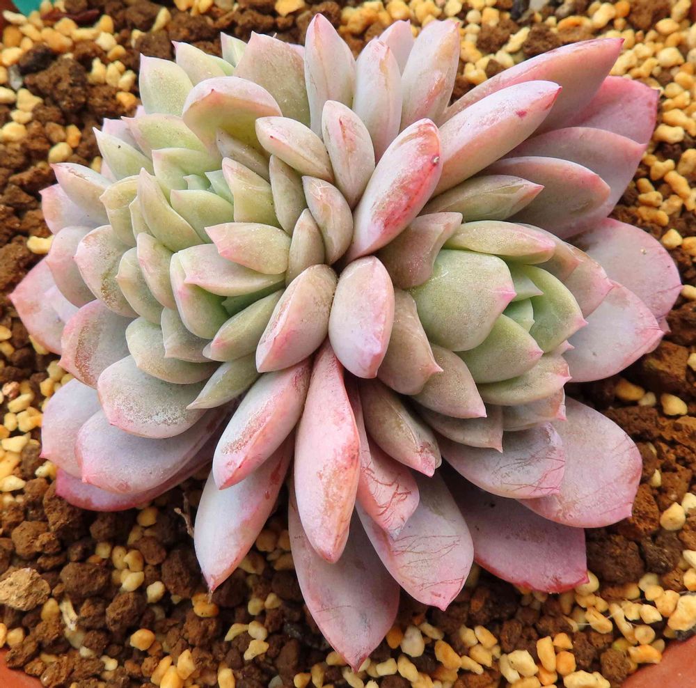 どうやら綴化したエケベリアのアンポラ。綴化すると紅葉が甘くなるのか,例年白っぽい葉にピンクが混ざった紅葉を見せてくれるけど,いまだに緑の部分が多く残っている。