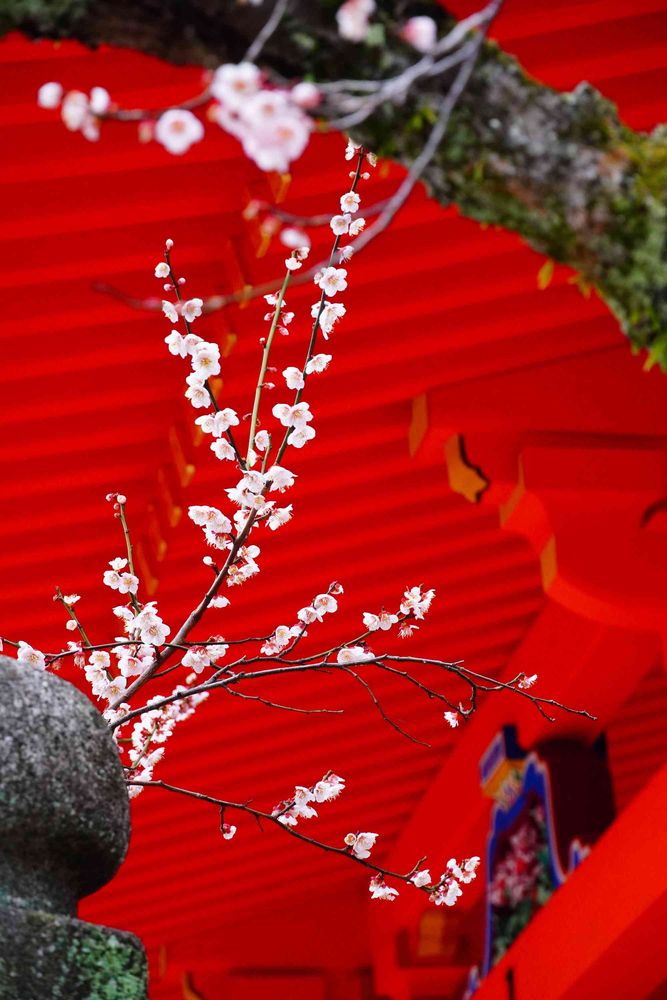 建物の朱色と梅、よく合いますねー⛩