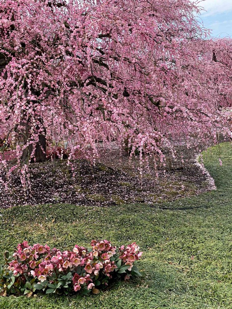 鈴鹿の森庭園の枝垂れ梅とクリスマスローズ、和洋の絶妙なバランス😊