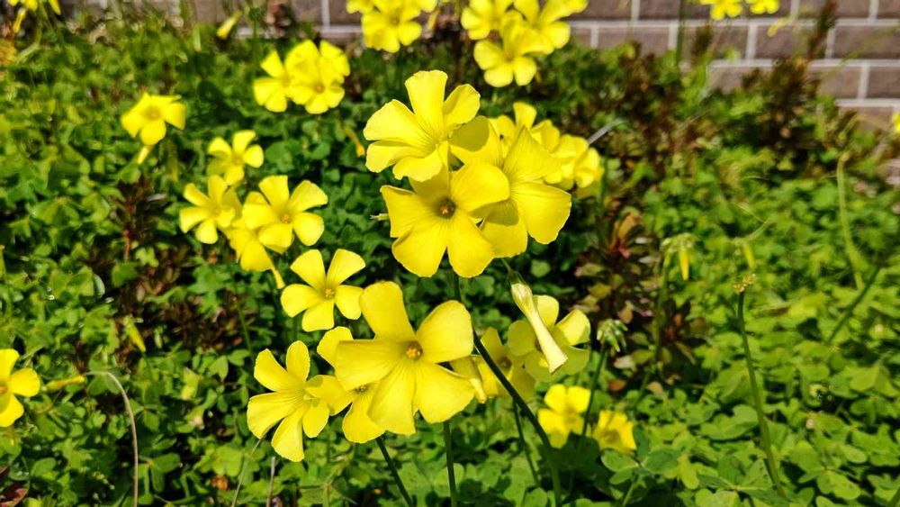 昨日の散歩道。大きな黄色い💛カタバミの花が、風に揺れてました✨南アフリカ原産の外来種、オオキバナカタバミだそうです。花の大きさ3~4cm、葉にはくろっぽい斑点がありました。繁殖力強そう😅