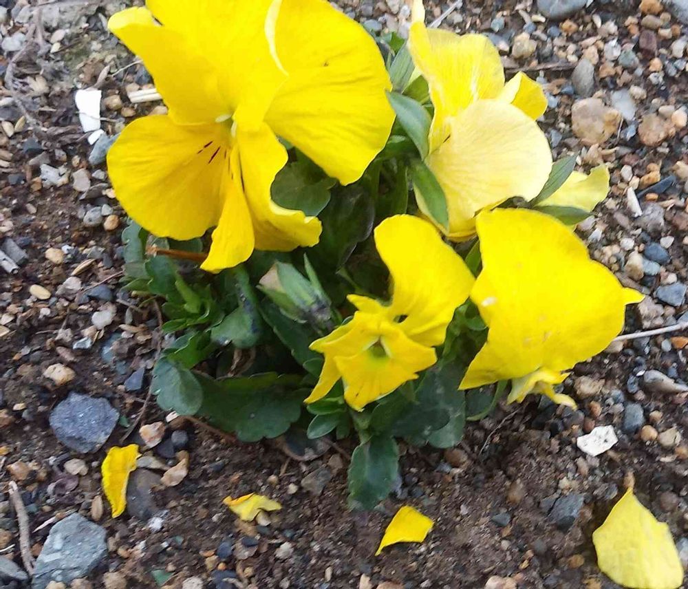 咲きたてのパンジーが無残な姿になっています。長く咲いている左側は無傷で、右側の花々はすべてちぎられた状態です。