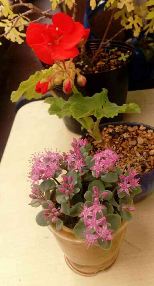 小鉢に挿し芽した日高ミセバヤと、小鉢に植え替えて締めたゼラニウムがともに咲きました〜(ゼラニウムは山野草ではないけれどたまたま貰ったものでして)