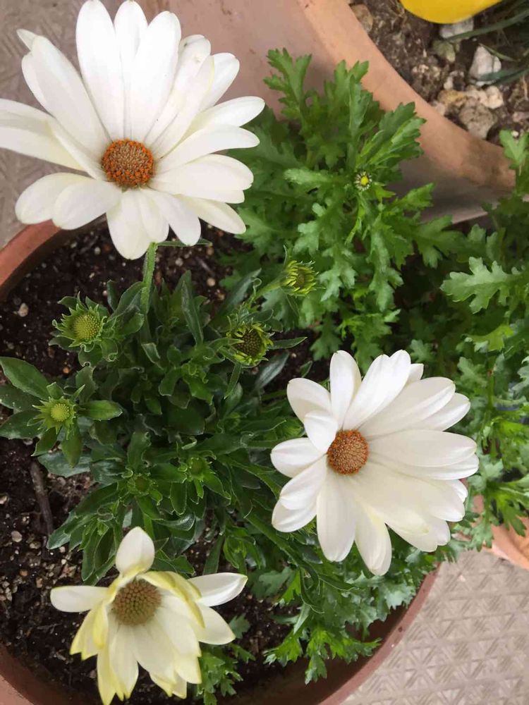こぼれ種から育ったノースポール(右上)はまだ蕾で…咲いてるのはオステオスペルマムなんです〜似たような花を一緒に植えてみたのですが…🤗 見て頂き有難うございます🙇♀️