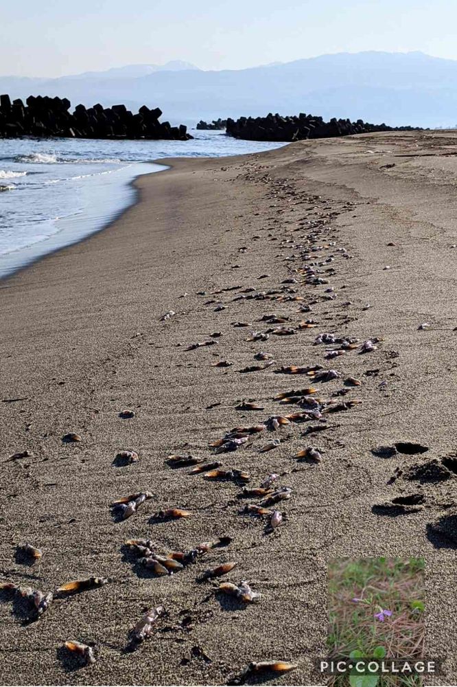 こちらではハタハタやブリコの打ち上げられた写真が新聞に載る事があります。私の所は海まで遠いので直接見た事はありませんが…ホタルイカのこのpicは😳驚き😆