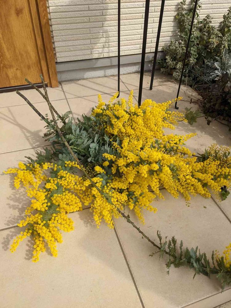 玄関先に御近所さんから待望の、待望のミモザが届いた〜笑