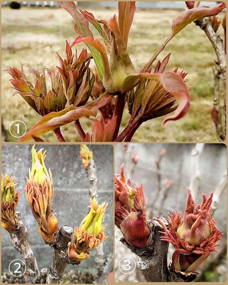 ①は2月6日、1ヶ月前に投稿した花芽の今です。10㎝位の成長で、蕾も見えて大きくなっています。この後、もう1ヶ月かけて10㎝成長し、葉を展開して花が咲きます。ボタンの1年間での成長は、ここまでです。芽吹きから2ヶ月かけて20㎝の成長・・これが1年間のボタンの全てです。その後、葉っぱ🌿の面積はいくらか大きくなるものの、目に見える変化は見られません。